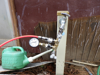 方法は、右図のように蛇口から水素ガスを配管内に送り込みます。