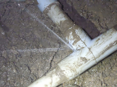 塩ビ管の分岐継手から水が噴き出しているのがわかります。