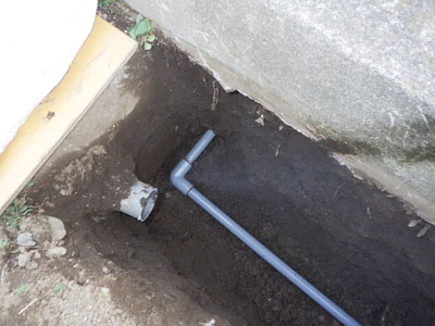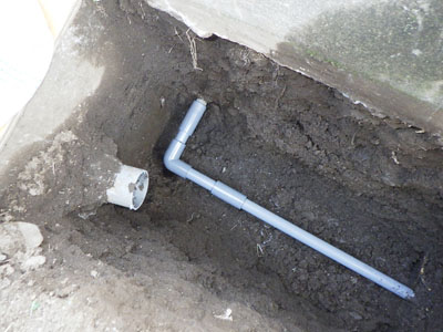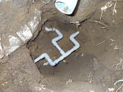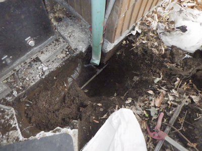 探知した場所を掘削してみると、見事に漏水箇所を発見できました。配管の深さは地面から約 45cm でした。