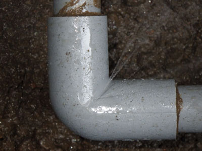 塩ビ管の継手から水が噴き出しているのがわかります。 |